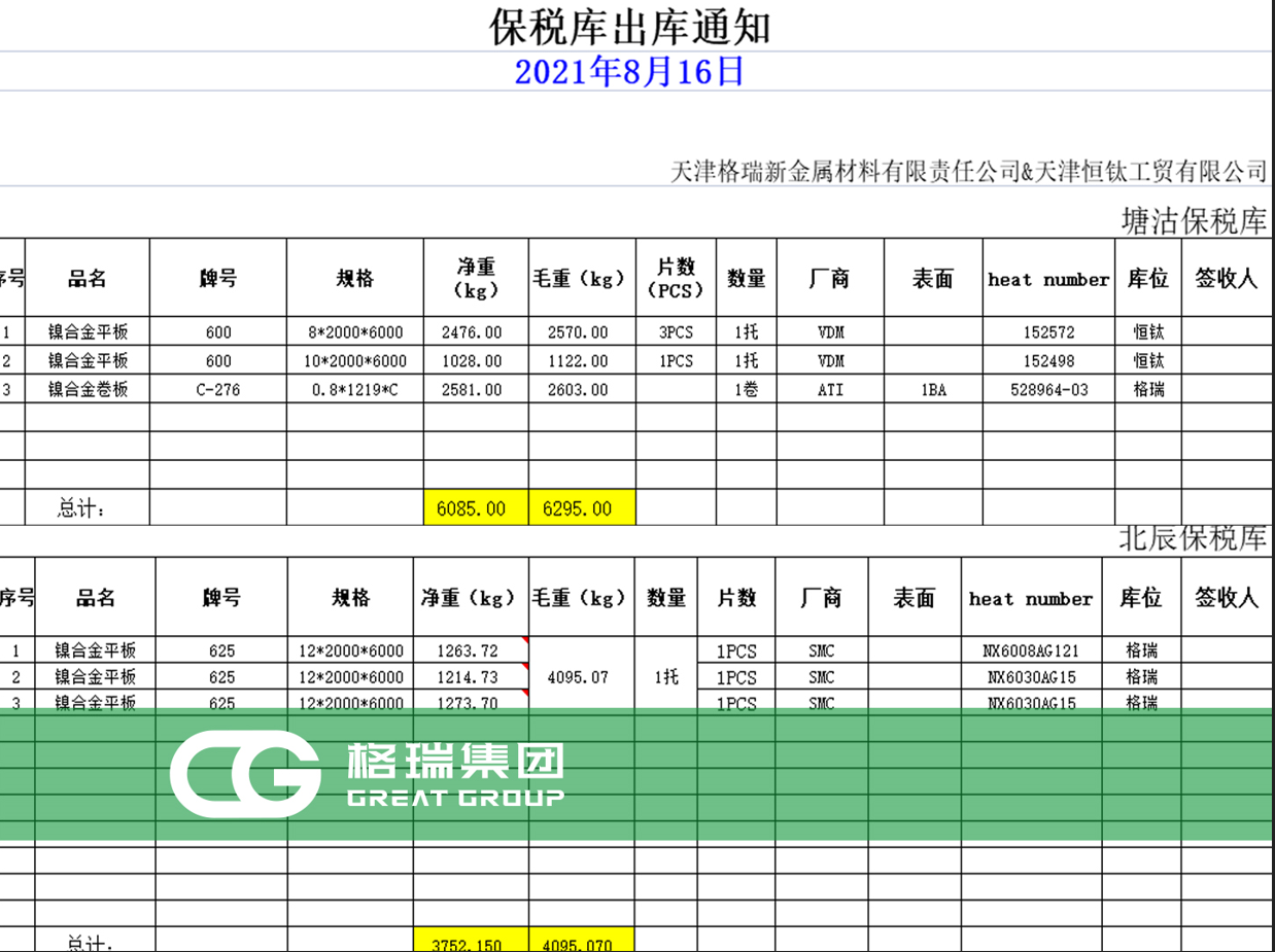 2021-08-17即將到港貨物明細(xì),鎳基合金