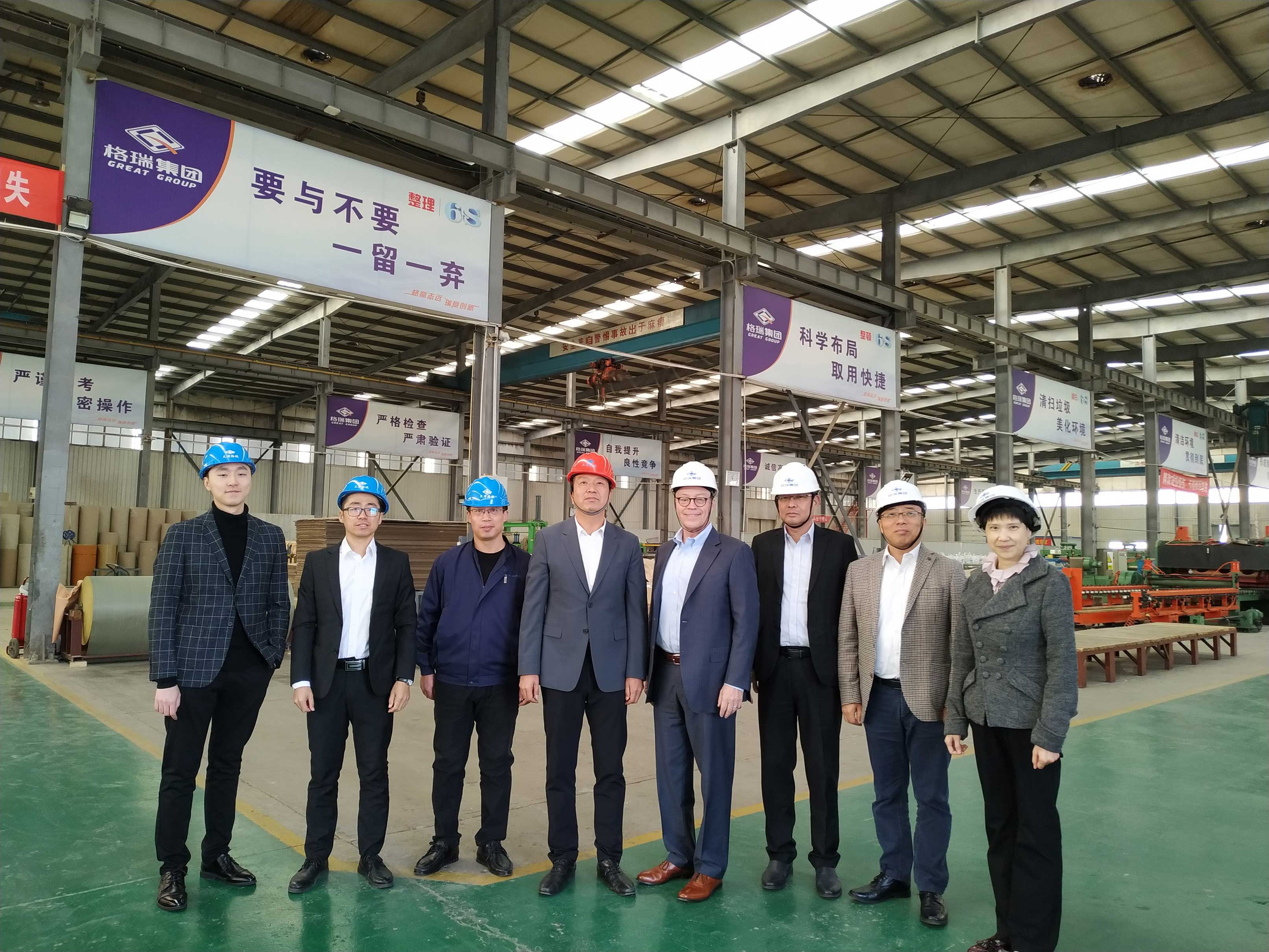 首先一行人參觀了格瑞剪切加工中心及庫房,期間Kevin B. Kramer先生和Vincent Fu先生分別對我司設(shè)備情況及庫房倉儲(chǔ)情況進(jìn)行了了解,二人了解情況后對我司以客戶為導(dǎo)向的“快而精”的運(yùn)營模式及倉儲(chǔ)量給予了高度贊揚(yáng),并表示希望與格瑞集團(tuán)有更深入的合作。