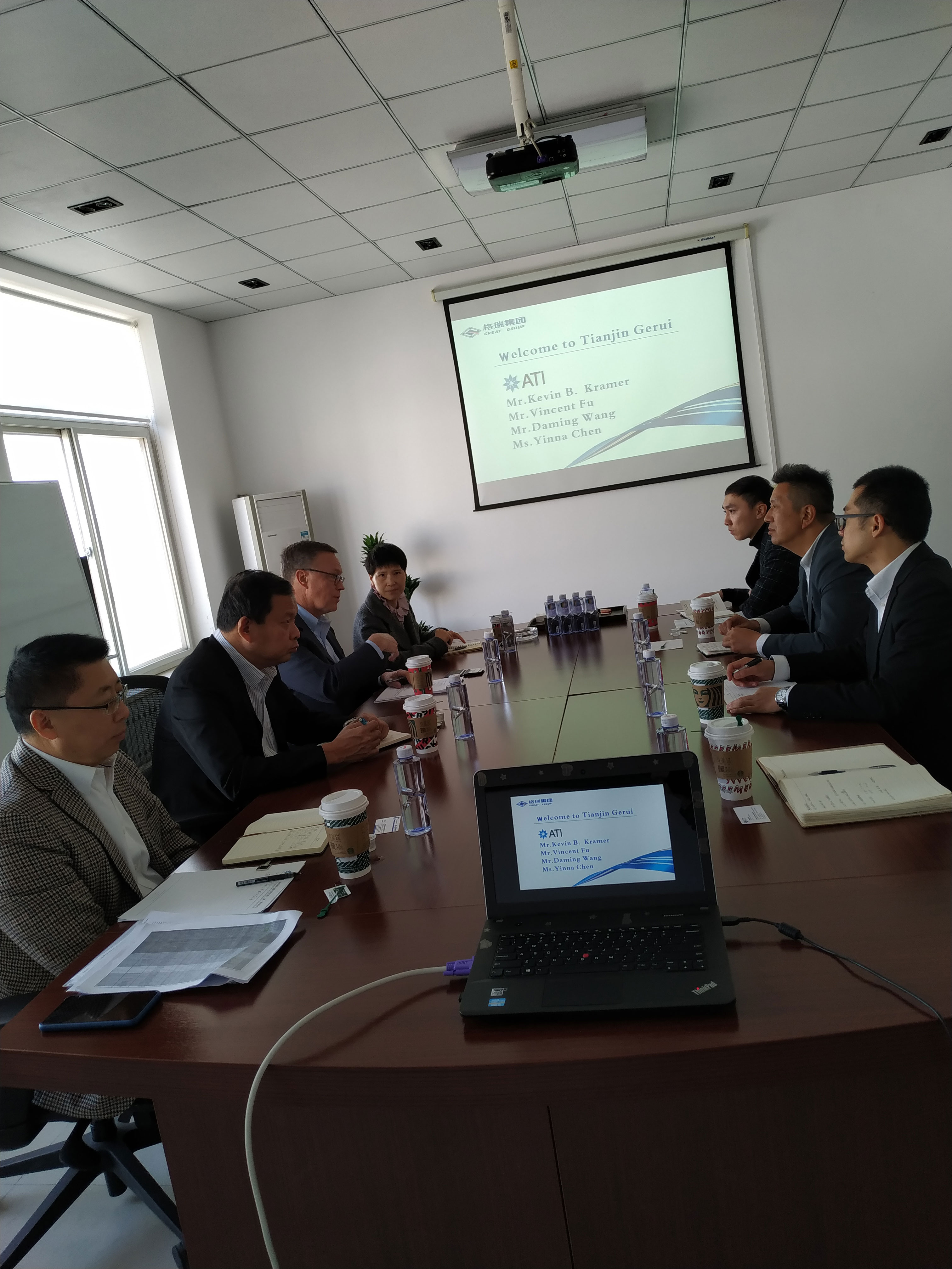 上午9:30許ATI集團(tuán)副總裁Kevin B. Kramer、ATI亞洲區(qū)總裁Vincent Fu攜同ATI中國區(qū)首席代表王大明及銷售經(jīng)理陳殷娜一行四人抵達(dá)格瑞集團(tuán)天津總部,格瑞集團(tuán)總經(jīng)理龐宏先生熱情接待。